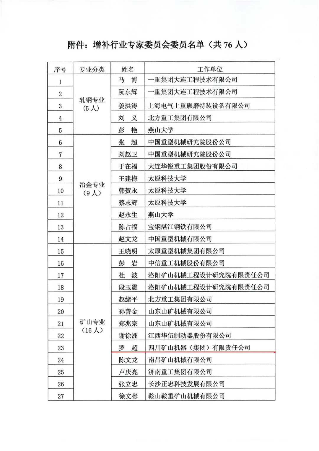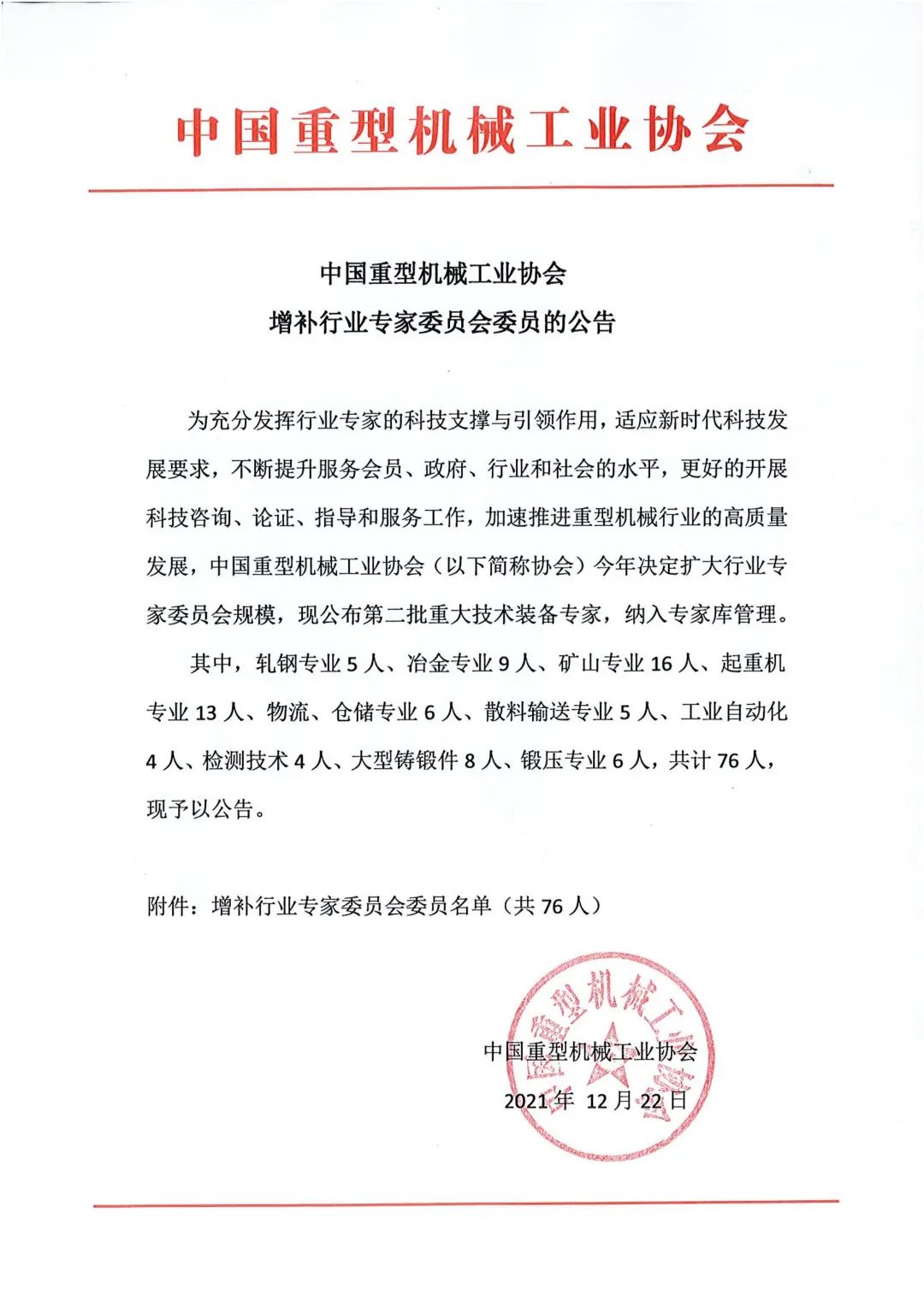 中國(guó)重型機(jī)械工業(yè)協(xié)會(huì)增補(bǔ)行業(yè)專家委員會(huì)委員的公告
