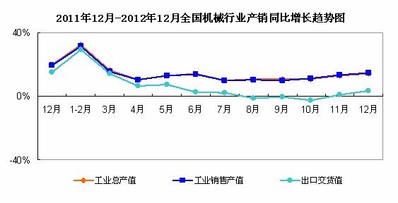 統(tǒng)計(jì)數(shù)據(jù)顯示,2012年1-12月,全國(guó)機(jī)械工業(yè)經(jīng)濟(jì)運(yùn)行速度同比持續(xù)呈現(xiàn)回升的態(tài)勢(shì)。12月份,工業(yè)總產(chǎn)值的累計(jì)同比增速為14.24%;工業(yè)銷售產(chǎn)值的累計(jì)同比增速為14.64%,出口交貨值的累計(jì)同比增速為3.26%。