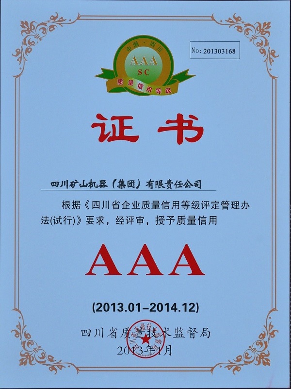 川礦集團(tuán)公司日前,從省質(zhì)檢局獲悉,四川礦山機(jī)器(集團(tuán))有限責(zé)任公司喜獲“四川省企業(yè)質(zhì)量信用等級AAA級企業(yè)”稱號,并頒發(fā)了榮譽(yù)證書。